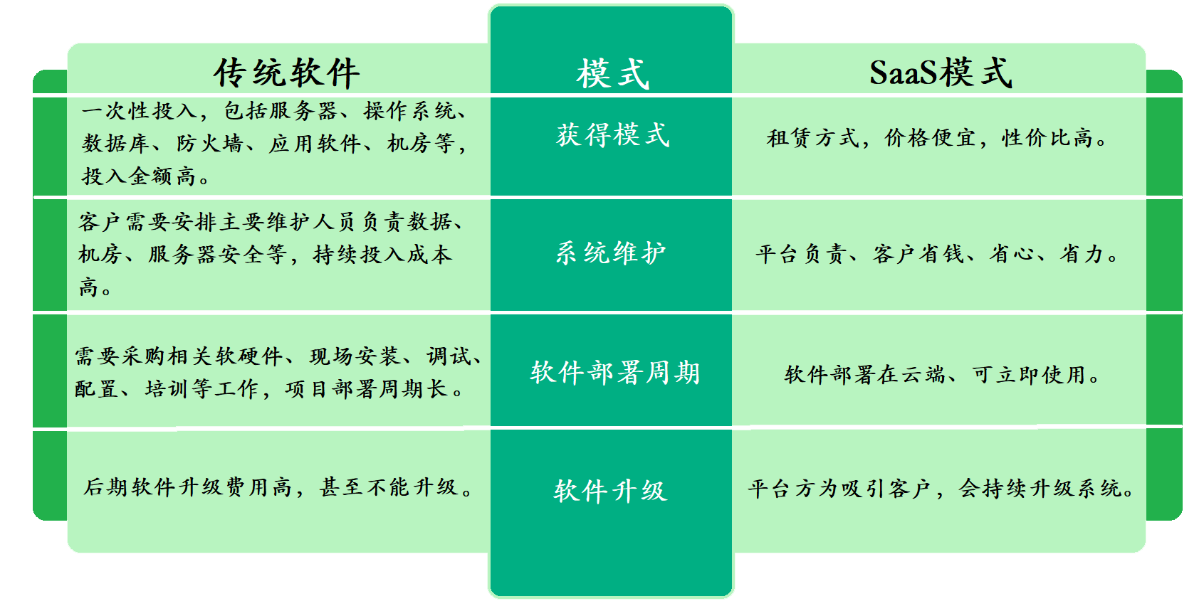 SaaS模式核心思想是一次性购买软件为租赁软件使用,客户省略购买服务器、操作系统、数据库、防火墙、应用软件、机房、IT维护人员等高额人力、物力投入,直接使用软件,从而省钱、省心、更省力