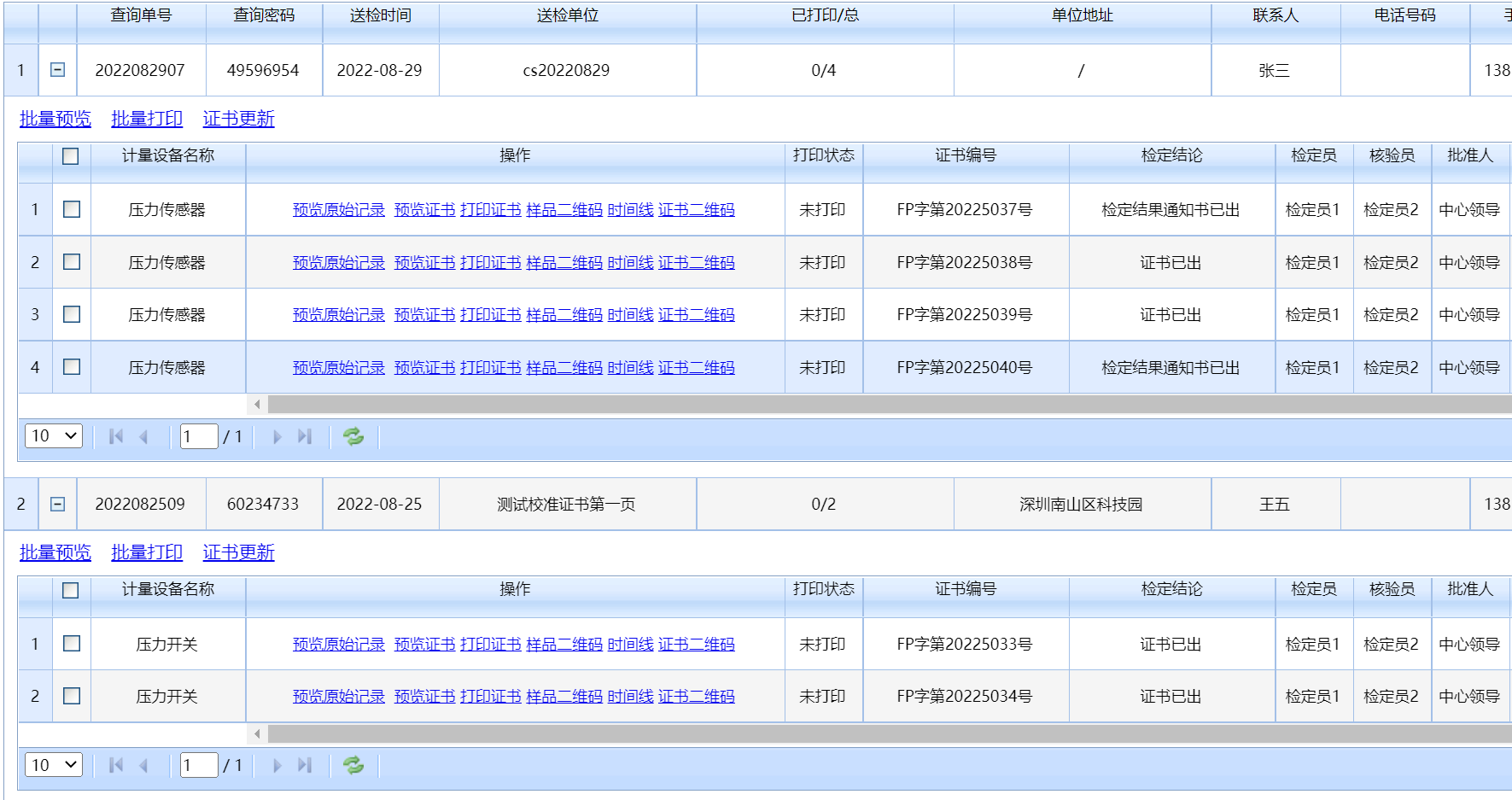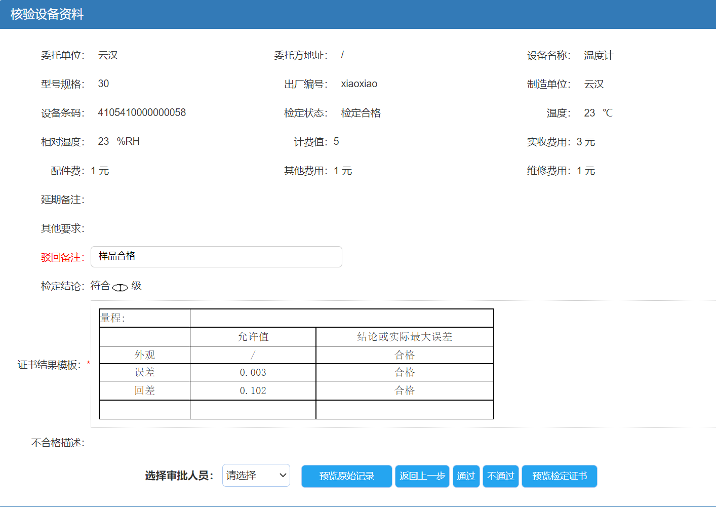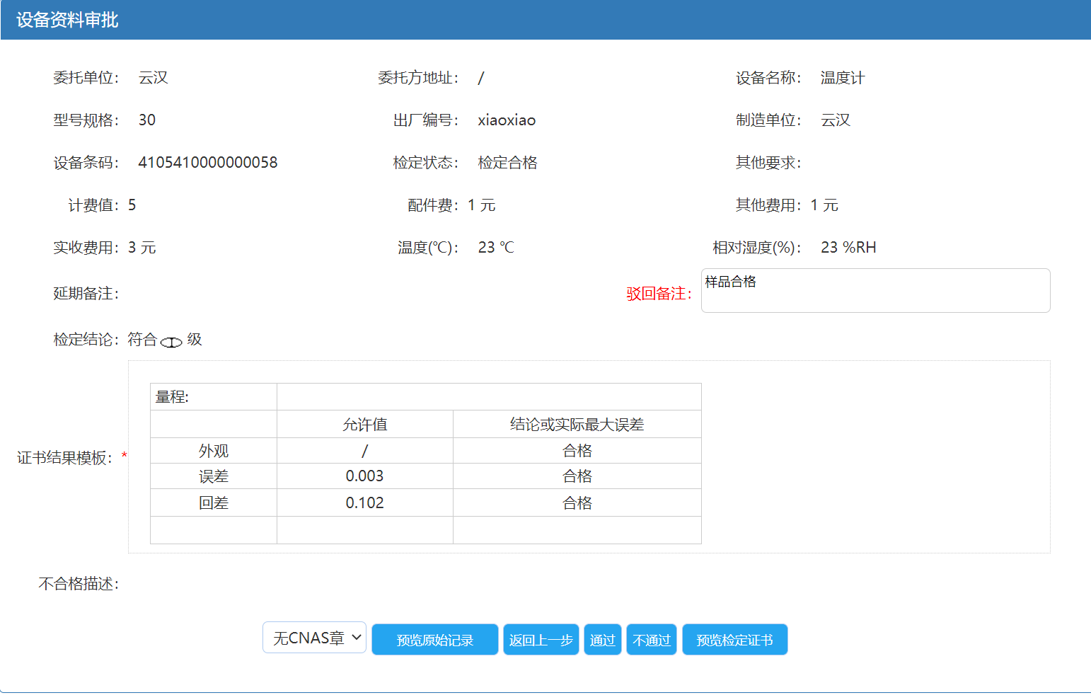 实现检定业务三级质量审核流程,实现客户报价->报价审核->收发室登记->室主任分配任务->检定->核验->审批->收费->证书发放全过程管控,支持条码扫描及打印,对进度超时的流程自动提醒等