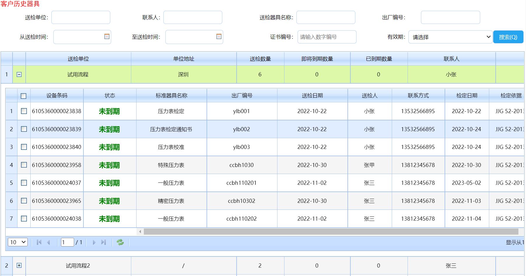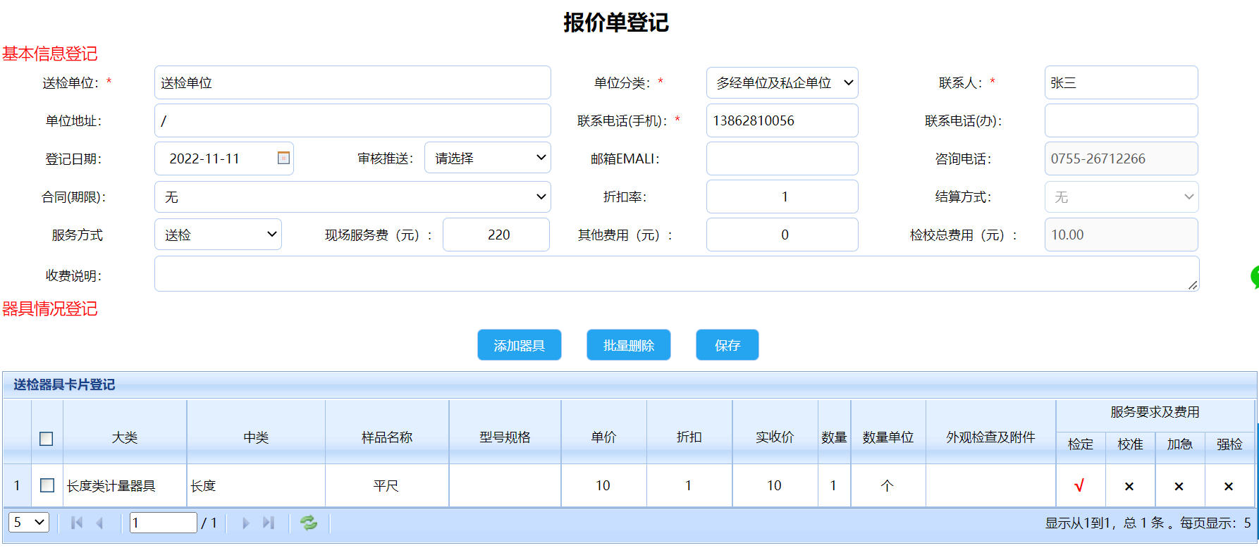 报价单填报支持新客户自动建档,老客户自动调入联系人、电话、历史报价等信息,且可把用户即将到期的所有计量器具导入,大大提高了报价单的录入方便性及报价的准确性,减少录入人员的工作量。