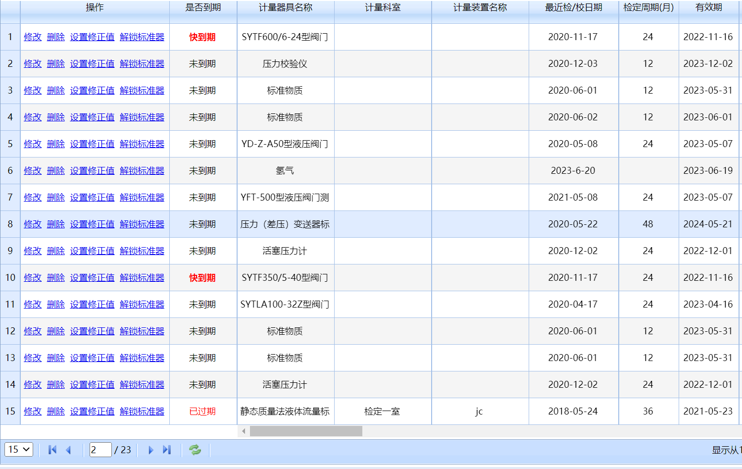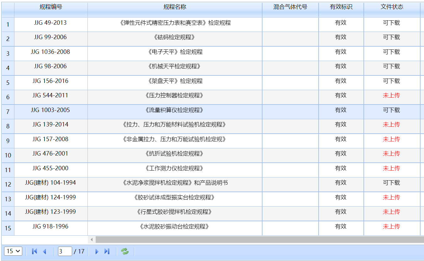 对检定规程进行管理,定义检定规程详细信息,管理检定规程的大、小类的分类及对应检定规程,记录检定规程的下载日志,对标准器进行管理,设定对应的检定规程,记录使用日志。